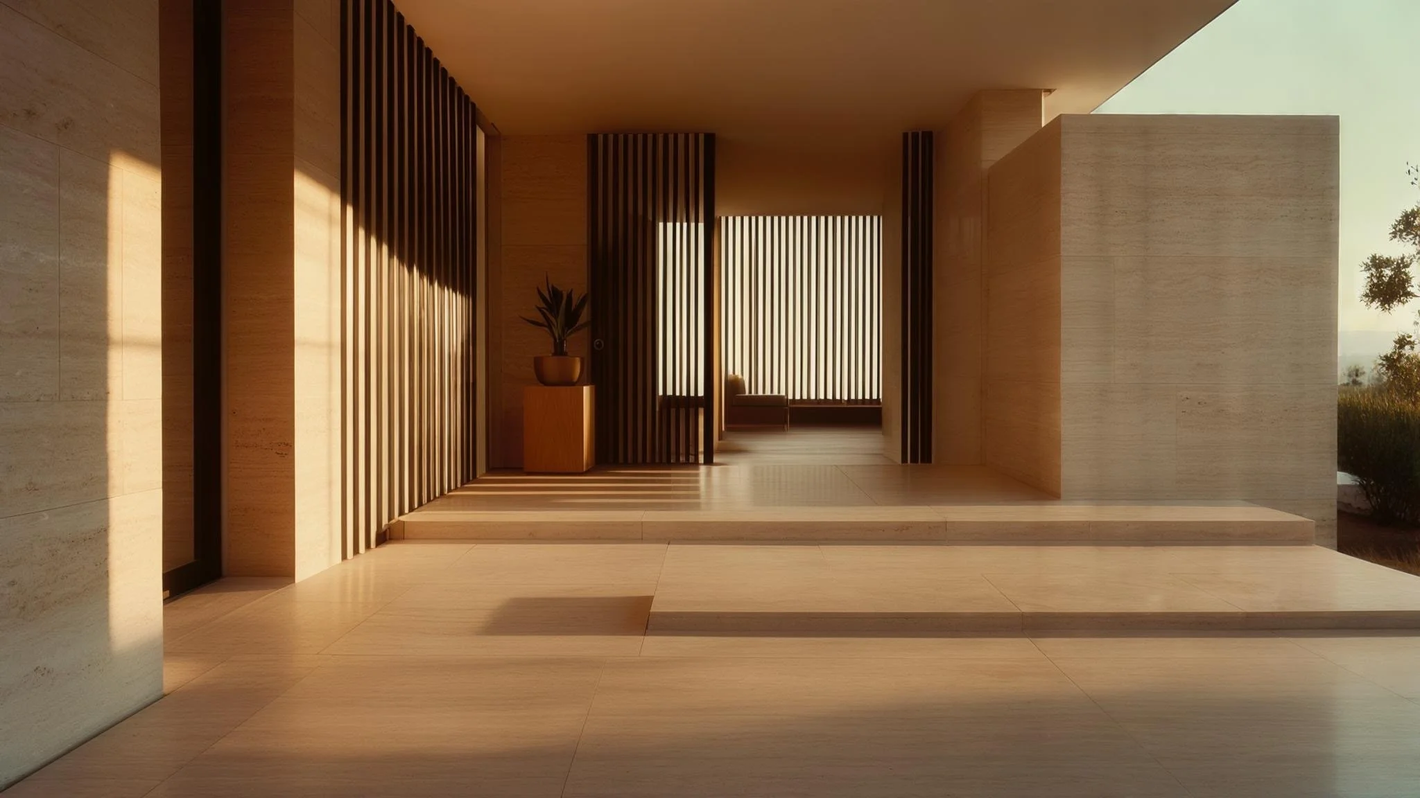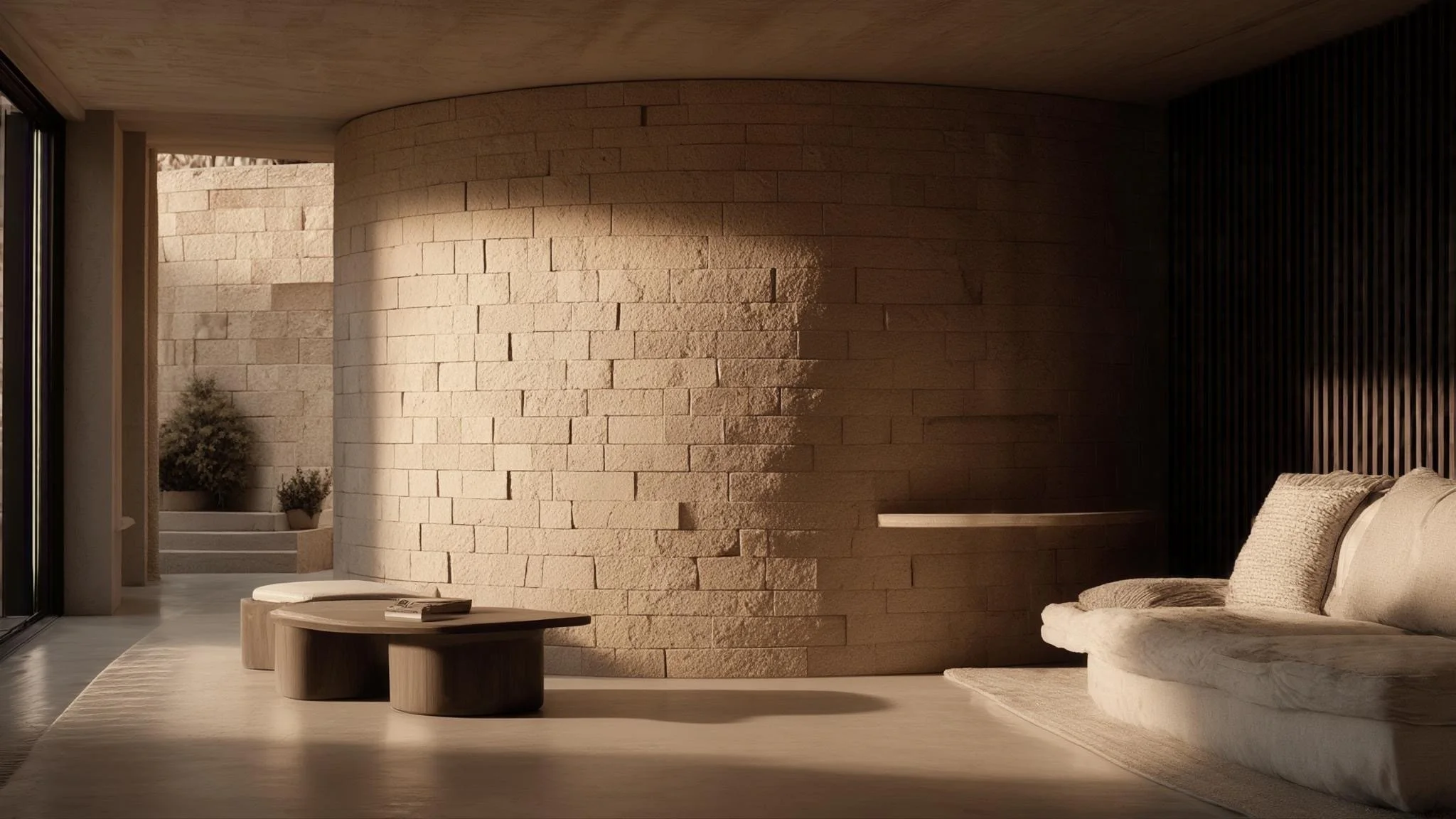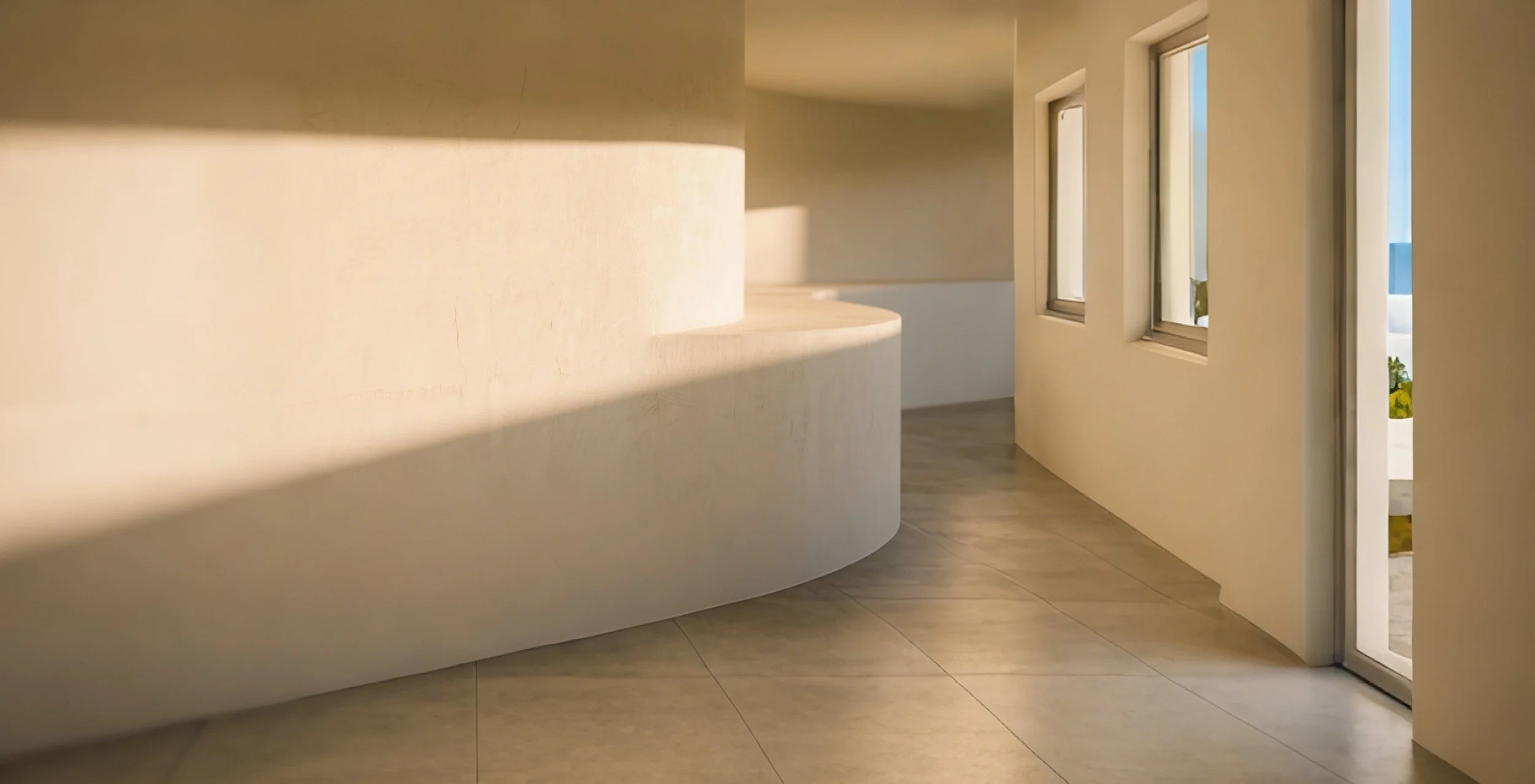 POLISHED STONE FLOOR IN HALLWAY MODERN MINIMALIST CURVED WALL, CLEAN, SOFT TEXTURED NATURAL, EYE LEV.jpeg