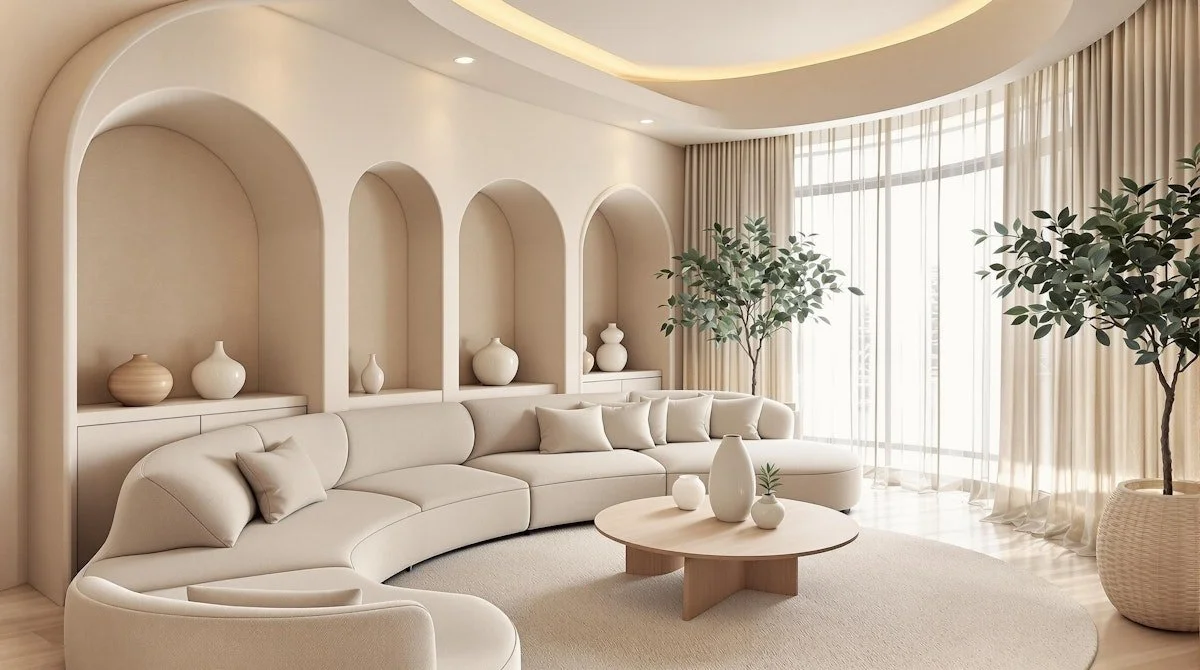 jimeng-2025-06-21-708-a modern minimalist wall featuring curves and a clean, soft texture. The view ....png