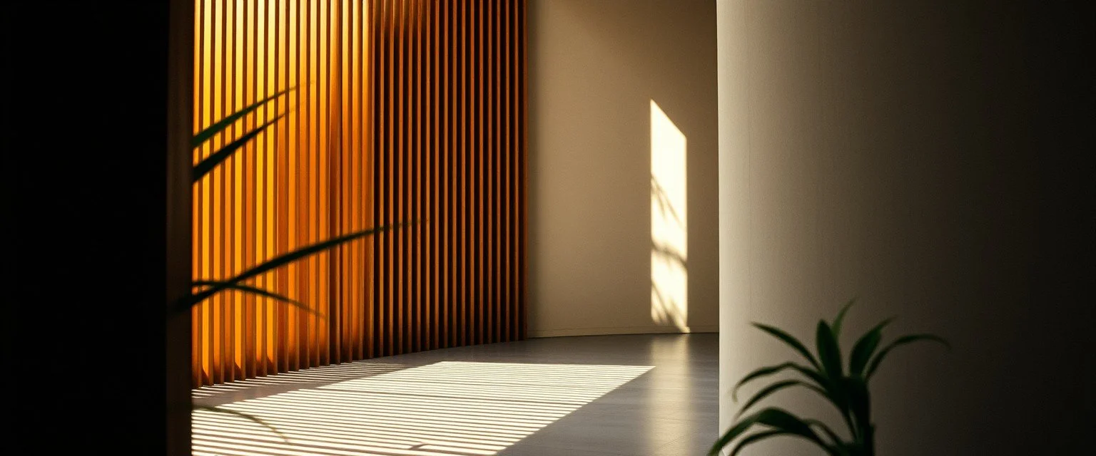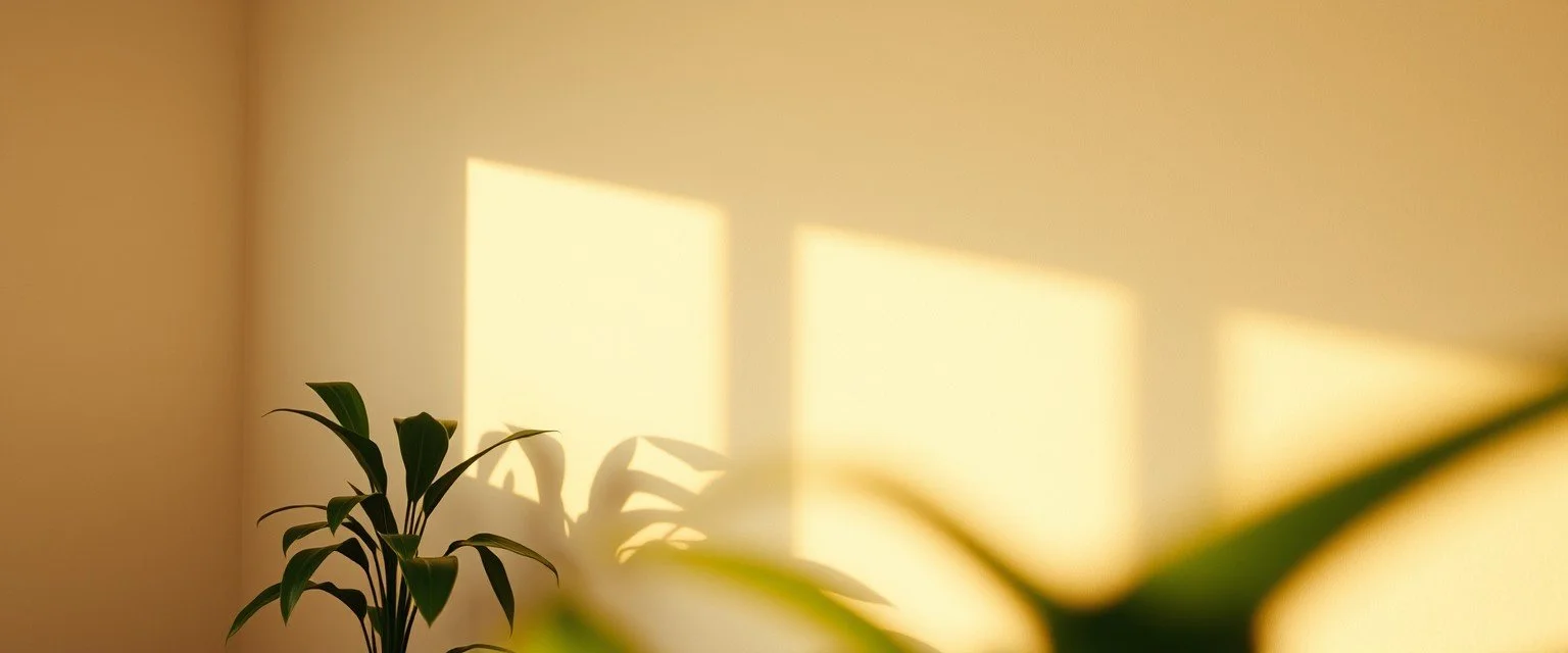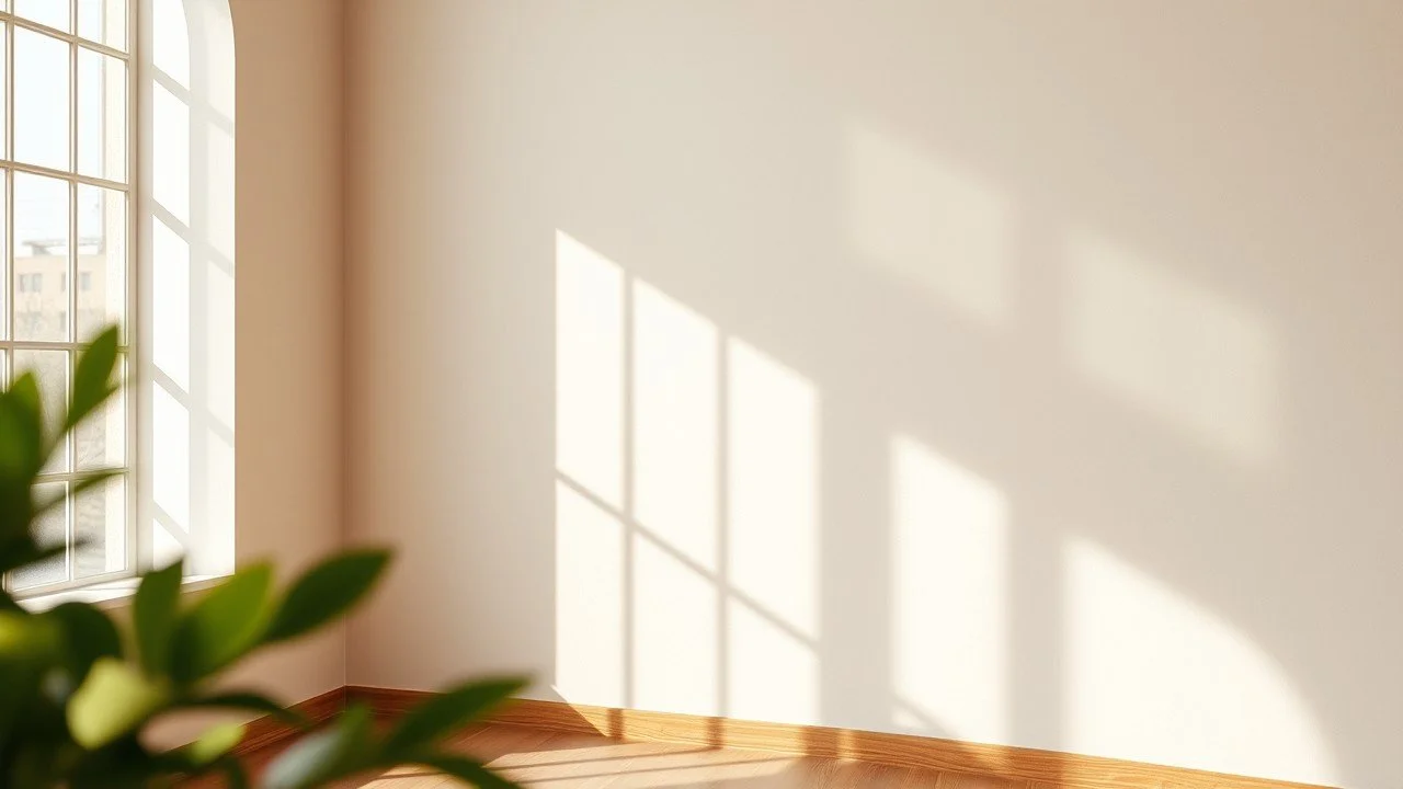 A bright and minimalist indoor space with sunlight casting shadows from a nearby plant onto a textur.jpeg