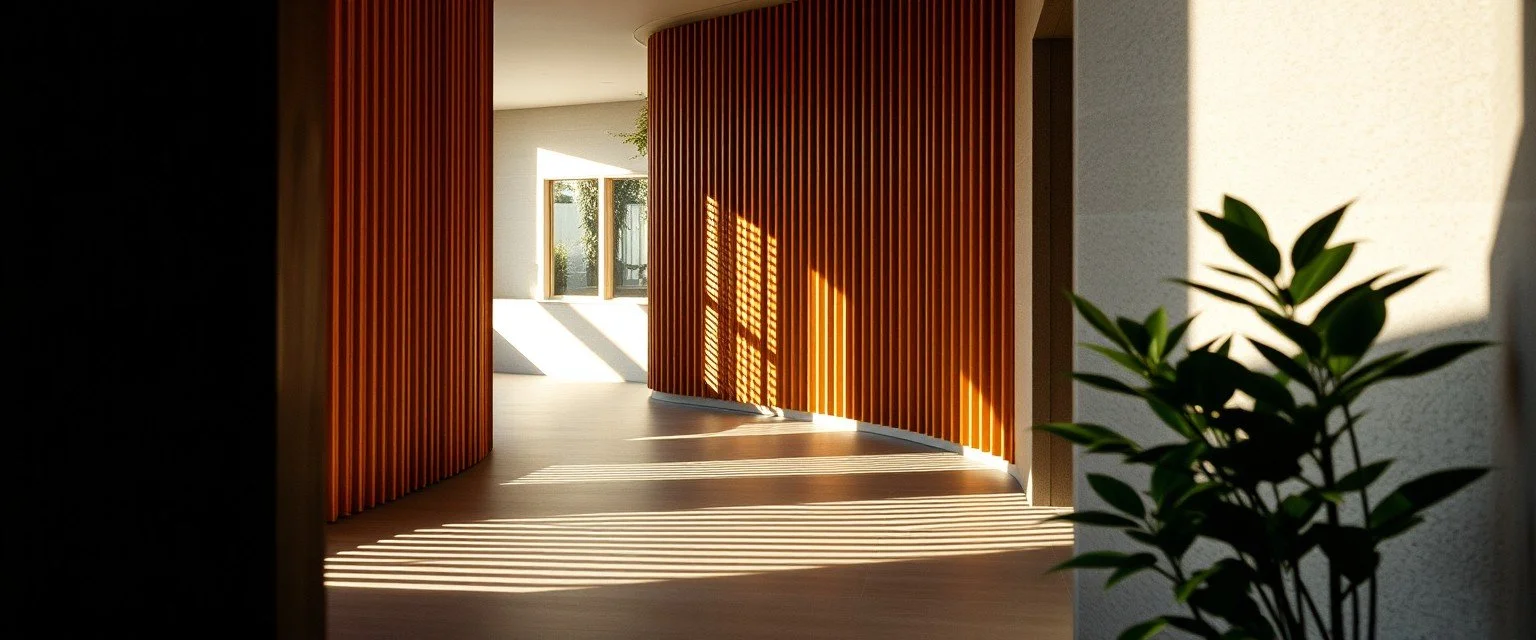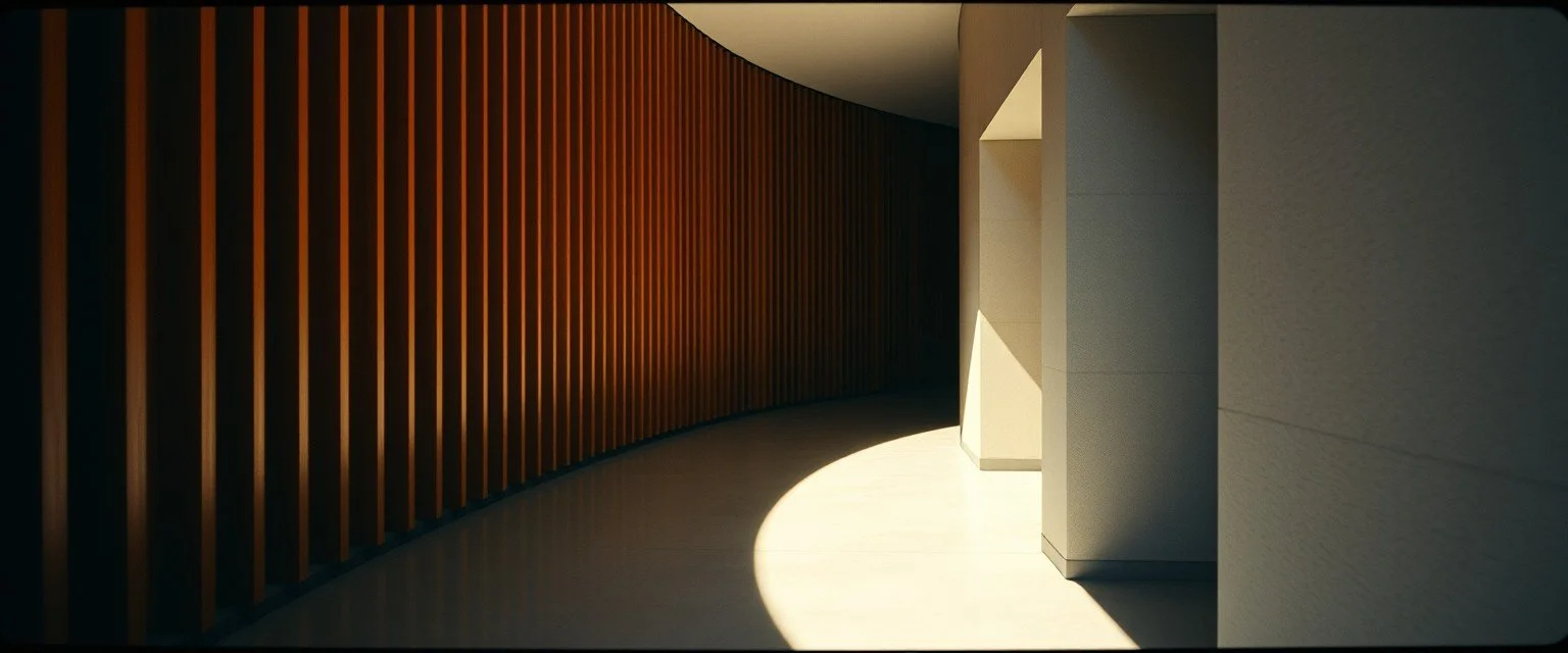 An architectural photograph of a modern minimalist hallway,  A dramatic, curved wall lined with vert.jpeg