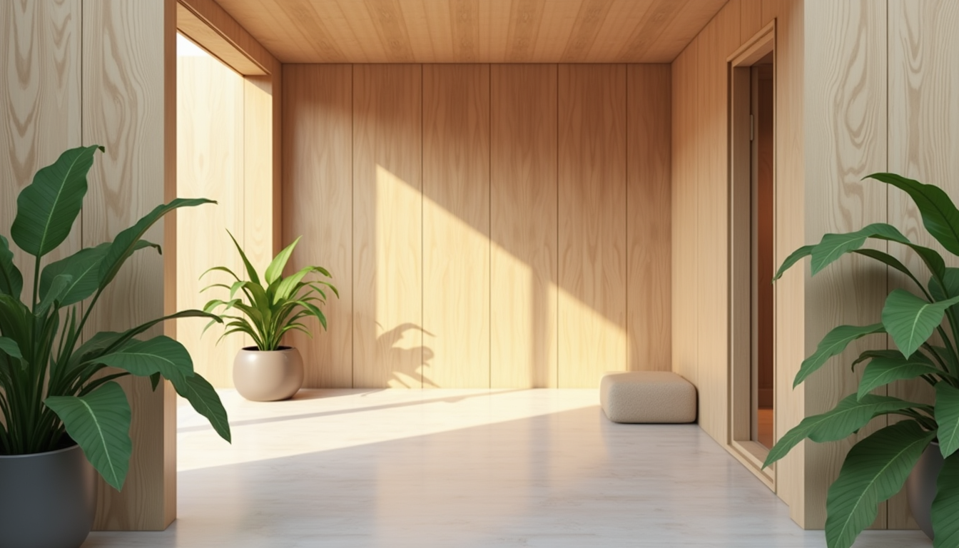 Photorealistic, modern room with a minimalist, organic wellness vibe. The scene features three walls—one back wall and two side walls—all covered in continuous, light natural wood paneling with a subtle, visible grain and a matte finish.png